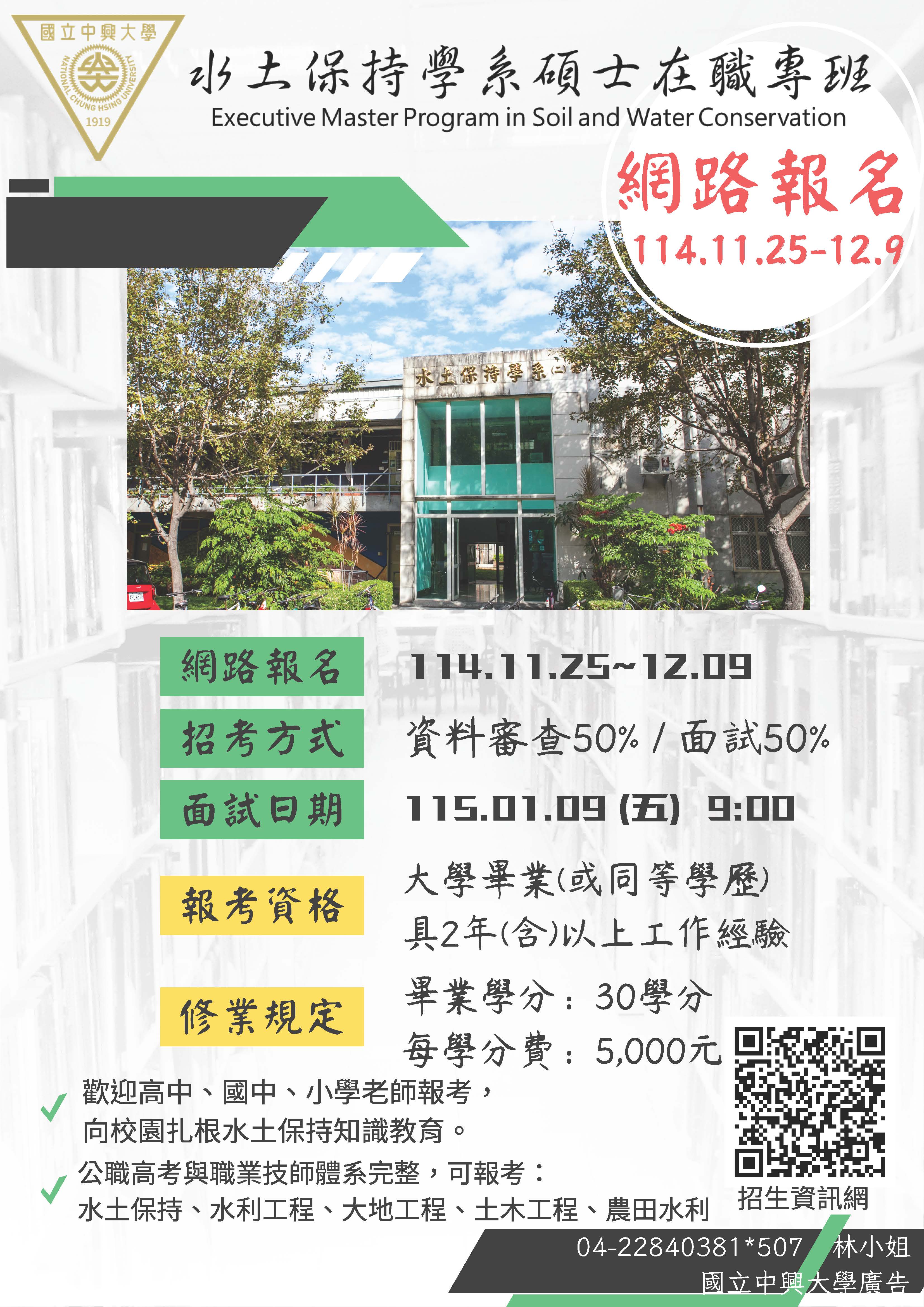 國立中興大學「水土保持學系碩士在職專班」115學年度招生訊息,敬請踴躍報考進修。